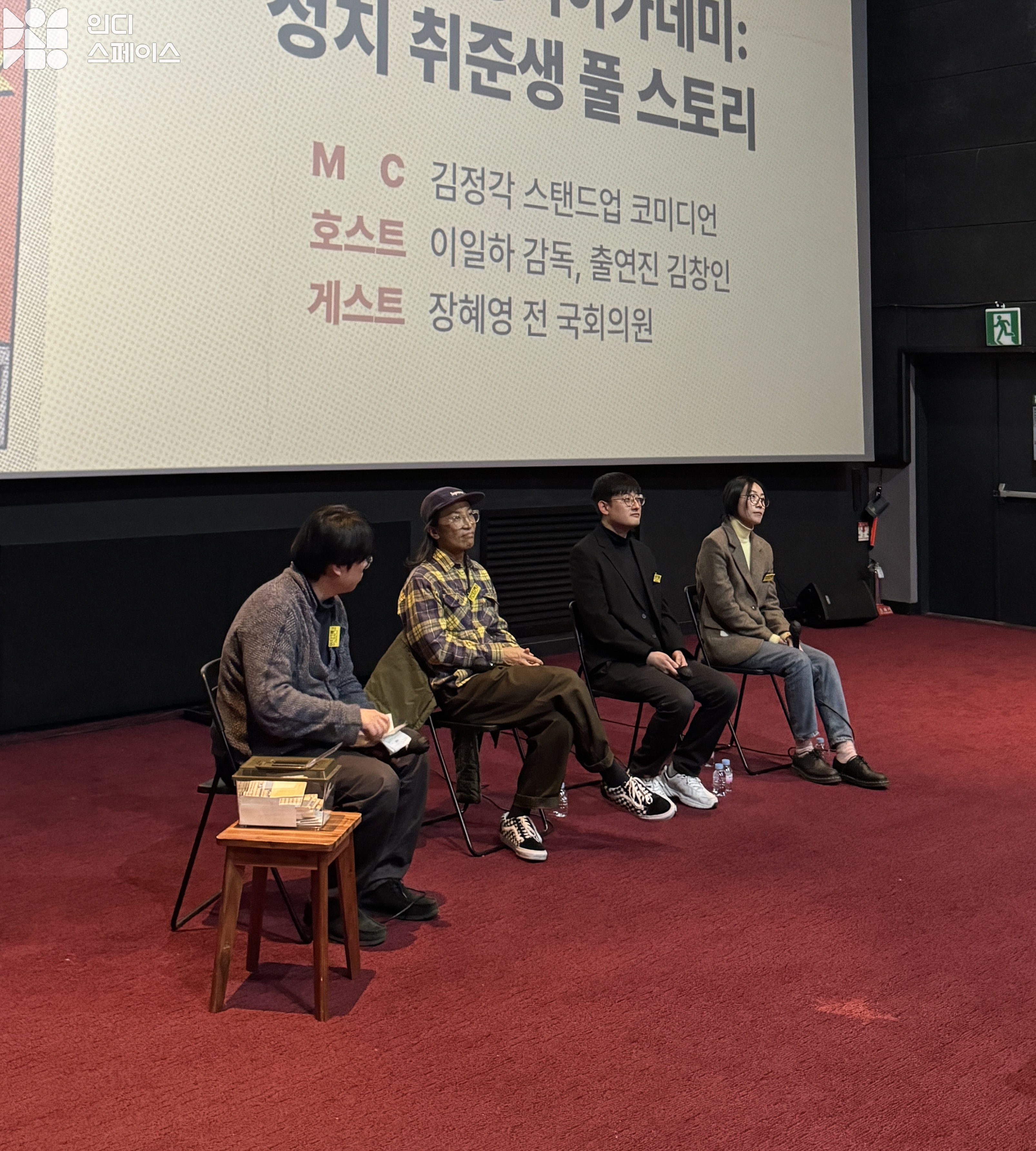 〈청년정치백서-쇼미더저스티스〉, 줄여 말하면 '청정백쇼'! 라고 부르고 있는데요. 영화 후에 이어지는 인디토크도 쇼의 형식을 따서 진행되었어요. 정치를 딱딱하고 불편하게 여기기보다 즐겁게 바라보자는 의미도 담겨있는데요. 오늘은 김정각 스탠드업 코미디언, 이일하 감독, 김창인 출연자 그리고 (영화에 잠시 출연하기도 했던!) 장혜영 전 국회의원과 함께했던 GV 현장의 모습을 전해드립니다. 웃음이 끊이지 않았던 와중에 서로의 진지한 속마음도 꺼내볼 수 있었던 소중한 시간의 조각을 보내드려요! |