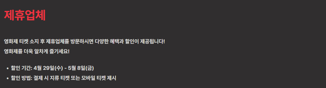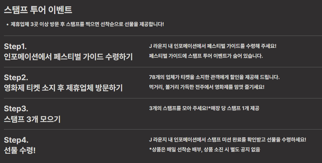 여기에 더해서! 제휴업체를 3곳 이상 방문해 스탬프를 찍는 이벤트에 참가한다면 영화제가 준비한 특별한 선물을 받을 수 있다고도 해요. 영화도 보고, 할인도 받고, 선물도 받을 수 있는 1석 3조의 이벤트를 즐겨보세요 🤗 |
